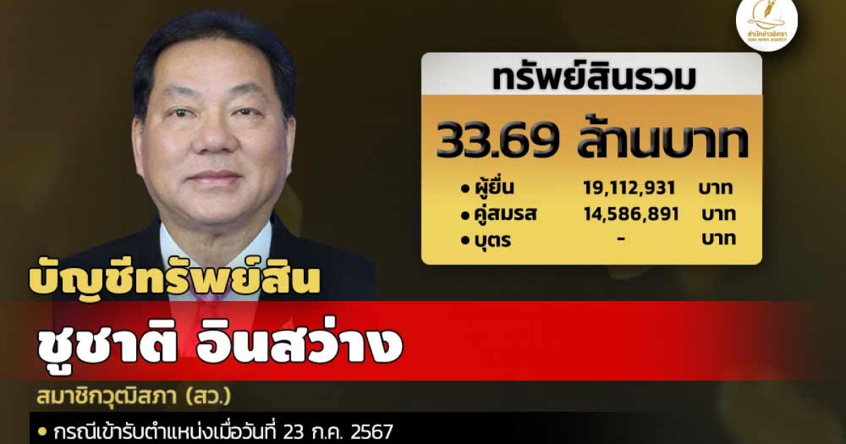สำนักงานคณะกรรมการป้องกันและปราบปรามการทุจริตแห่งชาติ (ป.ป.ช.) เปิดเผยบัญชีแสดงทรัพย์สินและหนี้สินของ ชูชาติ อินสว่าง สมาชิกวุฒิสภา ทรัพย์สิน 33.69 ล. ประกอบด้วย เงินฝาก 16 บัญชี มูลค่ารวม 9.66 ล. ที่ดิน 8 แปลง มูลค่ารวม 9.53 ล. โรงเรือนและสิ่งปลูกสร้าง 14 หลัง มูลค่ารวม 7.74 ล. ผู้ยื่นแจ้งมีรายได้ต่อปี 21,600 บาท