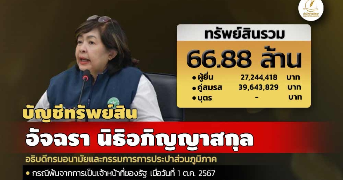 สำนักงานคณะกรรมการป้องกันและปราบปรามการทุจริตแห่งชาติ (ป.ป.ช.) เปิดเผยบัญชีแสดงทรัพย์สินและหนี้สินของ อัจฉรา นิธิอภิญญาสกุลน อธิบดีกรมอนามัยและกรรมการการประปาส่วนภูมิภาค ทรัพย์สิน 66.88 ล. ประกอบด้วย เงินฝาก 9 บัญชี มูลค่ารวม 3.96 ล. โรงเรือนและสิ่งปลูกสร้าง 2 หลัง มูลค่า 21 ล. ผู้ยื่นแจ้งมีรายได้ต่อปี 1.27 ล.