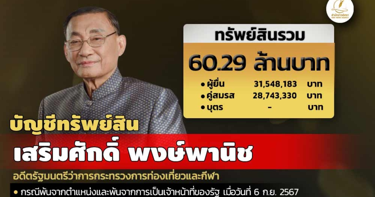 สำนักงานคณะกรรมการป้องกันและปราบปรามการทุจริตแห่งชาติ (ป.ป.ช.) เปิดเผยบัญชีแสดงทรัพย์สินและหนี้สินของ เสริมศักดิ์ พงษ์พานิช อดีตรัฐมนตรีว่าการกระทรวงการท่องเที่ยวและกีฬา ทรัพย์สิน 60.29 ล. ประกอบด้วย เงินสด 2 ล. เงินฝาก 11 บัญชี มูลค่ารวม 4.06 ล. โรงเรือนและสิ่งปลูกสร้าง 4 หลัง มูลค่ารวม 15.75 ล. ผู้ยื่นแจ้งมีรายได้ต่อปี 2.71 ล.