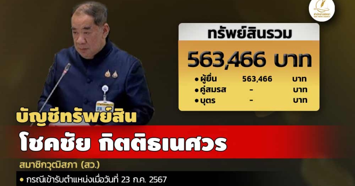 สำนักงานคณะกรรมการป้องกันและปราบปรามการทุจริตแห่งชาติ (ป.ป.ช.) เปิดเผยบัญชีแสดงทรัพย์สินและหนี้สินของ โชคชัย กิตติธเนศวร สมาชิกวุฒิสภา ทรัพย์สิน 563,466 บาท ประกอบด้วย เงินฝาก 8 บัญชี มูลค่ารวม 6,466 บาท ผู้ยื่น แจ้งมีรายได้ต่อปีโดยประมาณ 1.49 ล.