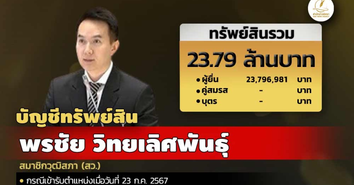 สำนักงานคณะกรรมการป้องกันและปราบปรามการทุจริตแห่งชาติ (ป.ป.ช.) เปิดเผยบัญชีแสดงทรัพย์สินและหนี้สินของ พรชัย วิทยเลิศพันธุ์ สมาชิกวุฒิสภา ทรัพย์สิน 23.79 ล. ประกอบด้วย เงินสด 151,932 บาท เงินฝาก 19 บัญชี มูลค่ารวม 9.92 ล. โรงเรือนและสิ่งปลูกสร้าง 2 หลัง มูลค่ารวม 5.34 ล. ผู้ยื่นแจ้งมีรายได้ต่อปี 1.52 ล.