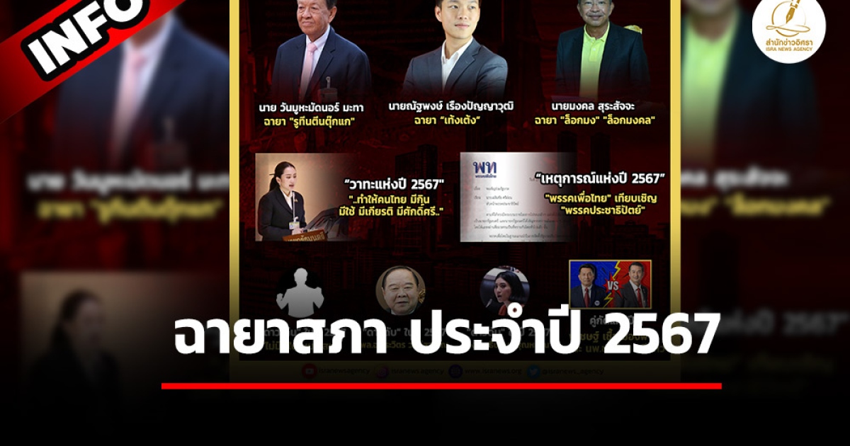 สื่อสภา ตั้งฉายา 67 สส. "เหลี่ยม(จน)ชิน"-"เนวิ(น)เกเตอร์" สภาสูง-"วันนอร์" รูทีนตีนตุ๊กแก-ประธานวุฒิฯ "ล็อกมง"-ผู้นำฝ่ายค้านฯ "เท้งเต้ง"- "บิ๊กป้อม-ธิษะณา" คว้าคู่ "ดาวดับ"-ไร้ดาวเด่น 3 ปีซ้อน-ยกขันหมาก "พท.-ปชป." เหตุการณ์แห่งปี สำนักข่าวอิศรา จึงนำข้อมูล มานำเสนอผ่านภาพอินโฟกราฟิก ดังนี้