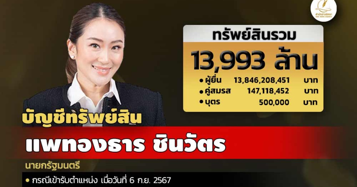 สำนักงานคณะกรรมการป้องกันและปราบปรามการทุจริตแห่งชาติ (ป.ป.ช.) เปิดเผยบัญชีแสดงทรัพย์สินและหนี้สินของ แพทองธาร ชินวัตร นายกรัฐมนตรี ทรัพย์สิน 13,993 ล. ประกอบด้วย เงินฝาก 39 บัญชี มูลค่ารวม 11.70 ล. ที่ดิน 16 แปลง มูลค่ารวม 757.12 ล. โรงเรือนและสิ่งปลูกสร้าง 12 หลัง มูลค่า 176.88 ล. ทรัพย์สินอื่นๆ มูลค่า 484.93 ล. เช่น ของสะสม(ตุ๊กตาแบร์บริค) 9 ตัว ทองคำแท่ง 75 บาท กระเป๋า 217 ใบ แหวน 108 วง