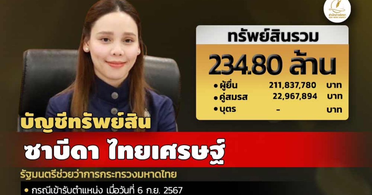 สำนักงานคณะกรรมการป้องกันและปราบปรามการทุจริตแห่งชาติ (ป.ป.ช.) เปิดเผยบัญชีแสดงทรัพย์สินและหนี้สินของ ซาบีดา ไทยเศรษฐ์ รัฐมนตรีช่วยว่าการกระทรวงมหาดไทย ทรัพย์สิน 234.80 ล. ประกอบด้วย เงินฝาก 11 บัญชี มูลค่ารวม 44.20 ล. ที่ดิน 70 แปลง มูลค่ารวม 115.19 ล. โรงเรือนและสิ่งปลูกสร้าง 6 หลัง มูลค่า 25.90 ล. ผู้ยื่นแจ้งมีรายได้ต่อปี 3.40 ล.