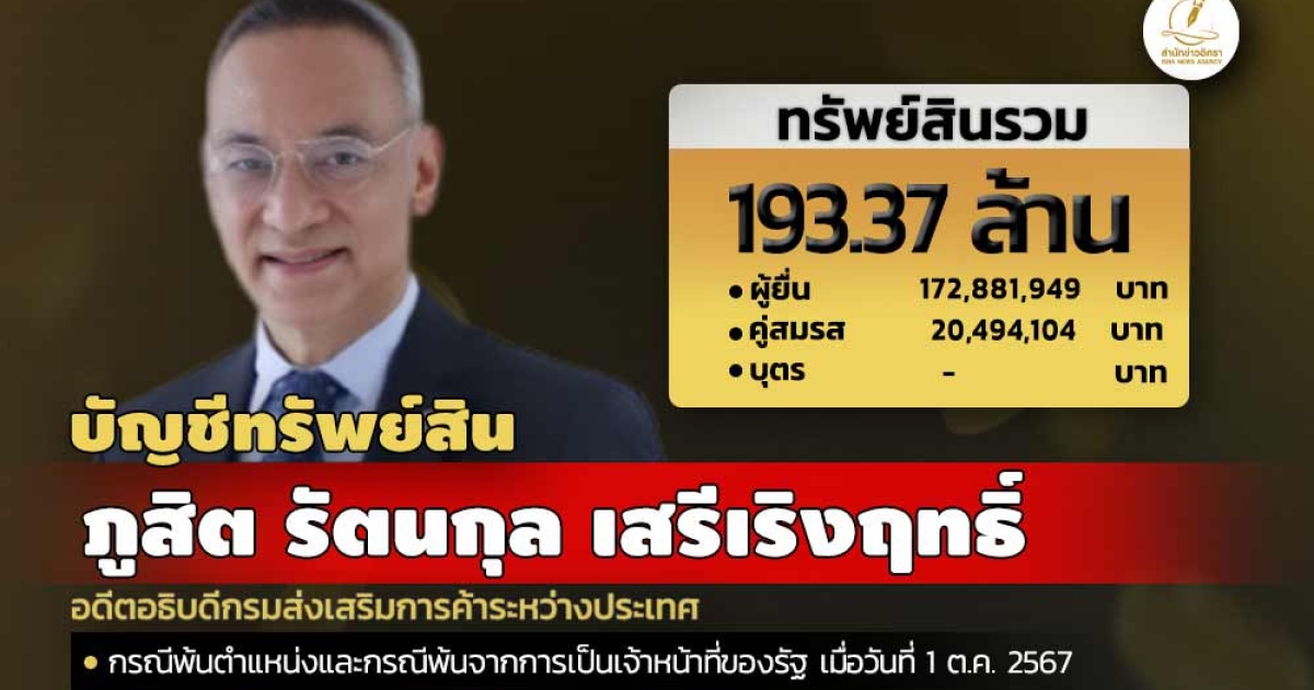 สำนักงานคณะกรรมการป้องกันและปราบปรามการทุจริตแห่งชาติ (ป.ป.ช.) เปิดเผยบัญชีแสดงทรัพย์สินและหนี้สินของ ภูสิต รัตนกุล เสรีเริงฤทธิ์ อดีตอธิบดีกรมส่งเสริมการค้าระหว่างประเทศ ทรัพย์สิน 193.37 ล. ประกอบด้วย เงินฝาก 24 บัญชี มูลค่ารวม 12.38 ล. ที่ดิน 4 แปลง มูลค่ารวม 17.03 ล. โรงเรือนและสิ่งปลูกสร้าง 7 หลัง มูลค่า 85.38 ล. ผู้ยื่นแจ้งมีรายได้ต่อปี 2.44 ล.