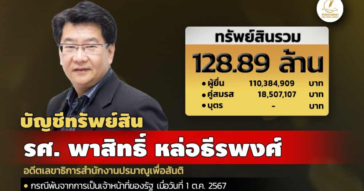 สำนักงานคณะกรรมการป้องกันและปราบปรามการทุจริตแห่งชาติ (ป.ป.ช.) เปิดเผยบัญชีแสดงทรัพย์สินและหนี้สินของ รองศาสตราจารย์ พาสิทธิ์ หล่อธีรพงศ์ เลขาธิการสำนักงานปรมาณูเพื่อสันติ และประธานกรรมการสถาบันวิจัยวิทยาศาสตร์และเทคโนโลยีแห่งประเทศไทย ทรัพย์สิน 128.89 ล. ประกอบด้วย เงินฝาก 35 บัญชี มูลค่ารวม 28.37 ล. ที่ดิน 6 แปลง มูลค่ารวม 78.71 ล. โรงเรือนและสิ่งปลูกสร้าง 1 หลัง มูลค่า 600,000 บาท ผู้ยื่นแจ้งมีรายได้ต่อปี 2.59 ล.