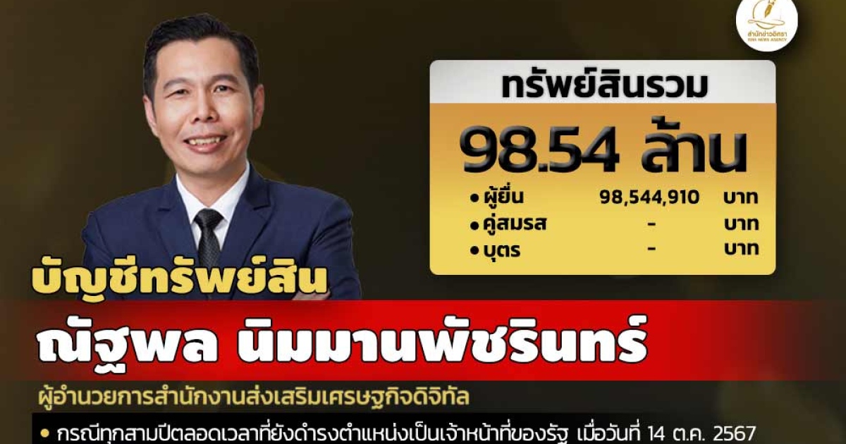 สำนักงานคณะกรรมการป้องกันและปราบปรามการทุจริตแห่งชาติ (ป.ป.ช.) เปิดเผยบัญชีแสดงทรัพย์สินและหนี้สินของ ณัฐพล นิมมานพัชรินทร์ ผู้อำนวยการสำนักงานส่งเสริมเศรษฐกิจดิจิทัล ทรัพย์สิน 98.54 ล. ประกอบด้วย เงินสด 345,000 บาท เงินฝาก 12 บัญชี มูลค่ารวม 10.07 ล. โรงเรือนและสิ่งปลูกสร้าง บ้าน 2 หลัง ในจังหวัดนนทบุรี มูลค่า 8.60 ล. ผู้ยื่นแจ้งมีรายได้ต่อปี 7.46 ล.