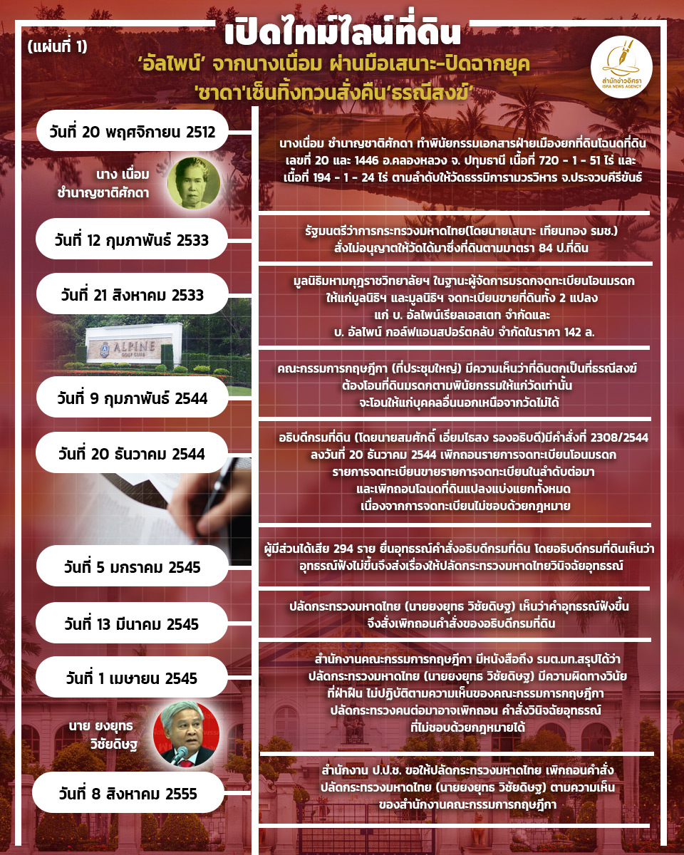 ต่อมาเมื่อนางเนื่อม ได้ถึงแก่กรรมเมื่อวันที่ 22 พ.ค.2514 ได้มีการแต่งตั้งผู้จัดการมรดก และมีการโอนมรดกที่ดินทั้งสองแปลงดังกล่าวให้แก่มูลนิธิมหามกุฏราชวิทยาลัย ในพระบรมราชูปถัมภ์ ขณะที่ในช่วงเดือน ก.พ.2533 นายเสนาะ เทียนทอง รมช.มหาดไทย จะสั่งไม่อนุญาตให้วัดได้มาซึ่งที่ดินตามมาตรา 84 ป.ที่ดิน และต่อมาได้มีการจดทะเบียนขายให้แก่นิติบุคคลอื่นเป็นผู้ถือกรรมสิทธิ์ กระทั่งในเวลาต่อมามูลนิธิมหามงกุฎฯ ได้ขายที่ดิน 2 แปลงดังกล่าวให้แก่บริษัท อัลไพน์ เรียลเอสเตท จำกัด และบริษัท อัลไพน์ กอล์ฟ แอนด์ สปอร์ตคลับ จำกัด ในราคา 142 ล้านบาท