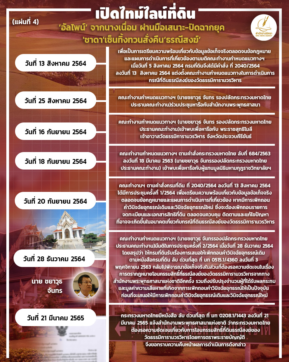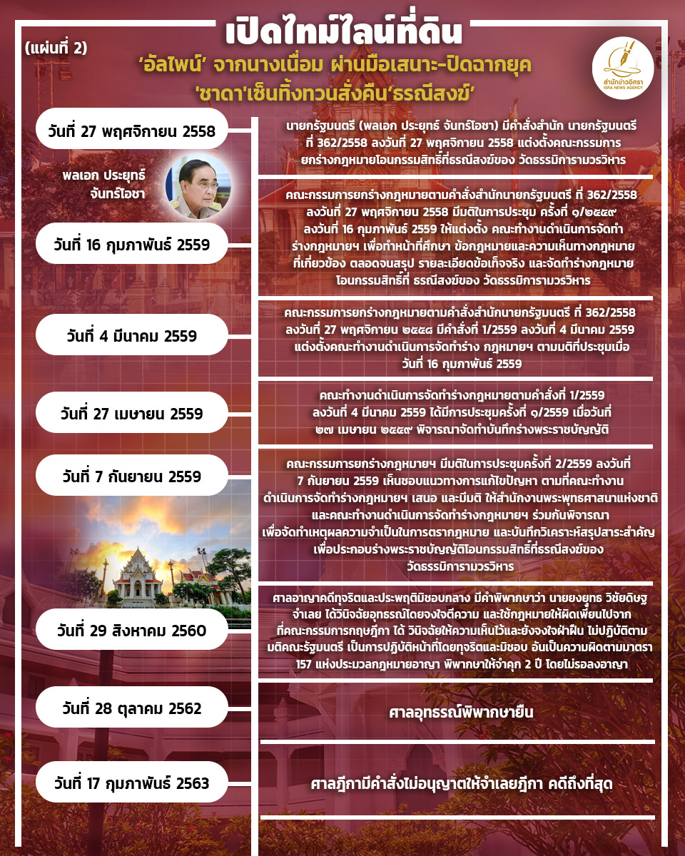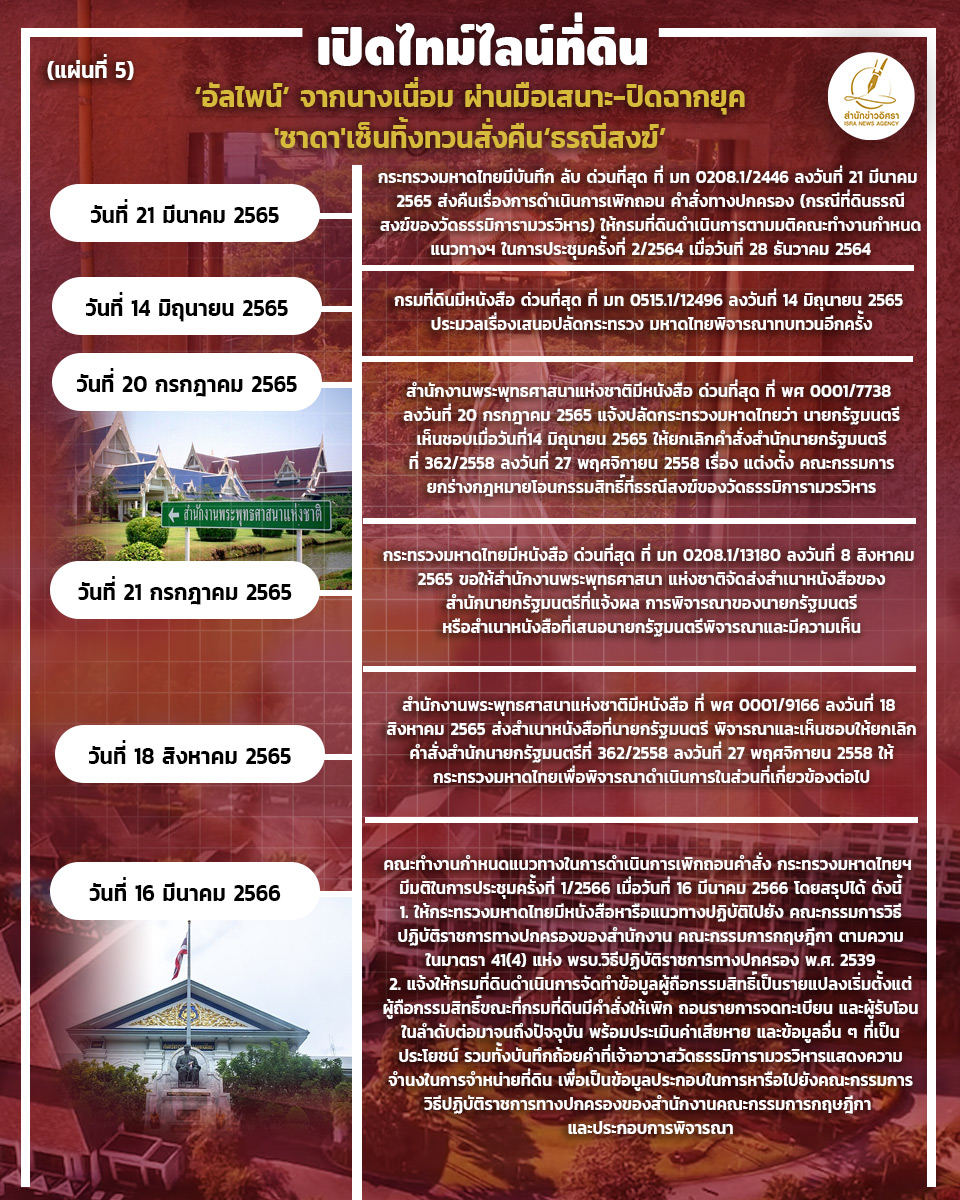สำนักข่าวอิศรา (www.isranews.org) รายงานว่า เมื่อเร็วๆนี้ กรมที่ดิน ได้จัดทำรายงานสรุปชี้แจงข้อเท็จจริงเกี่ยวกับการดำเนินการเพื่อพิจารณาเพิกถอนคำสั่งทางปกครอง (กรณีที่ธรณีสงฆ์ของวัดธรรมิการามวรวิหาร) สำนักข่าวอิศรา จึงนำข้อมูล มานำเสนอผ่านภาพอินโฟกราฟิก ดังนี้