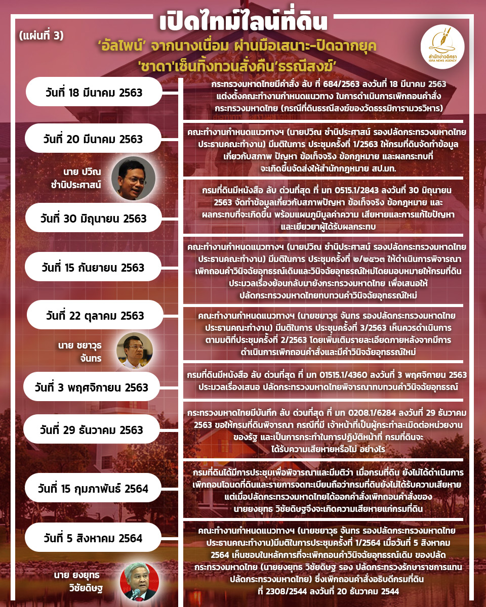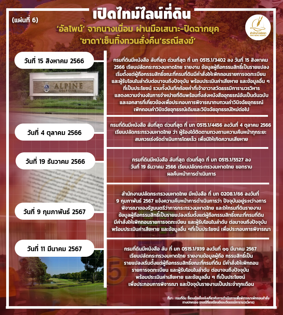 ก่อนที่จะมีปัญหาข้อพิพากษาตามมาจำนวนมาก หลายยุคหลายสมัย เรื่องราวใหญ่โตเข้าสู่กระบวนการพิจารณาทางศาล จนกระทั่งนายชาดา ไทยเศรษฐ์ ขณะดำรงตำแหน่ง รมช.มหาดไทย ได้ทำหนังสือบันทึกที่ มท 0100.3/324 ลงวันที่ 3 ก.ย.2567 หรือเพียง 3 วัน ก่อนที่นายชาดา จะพ้นจากตำแหน่ง รมช.มหาดไทย ไปถึงปลัดกระทรวงมหาดไทย โดยขอให้กระทรวงมหาดไทยพิจารณาเพิกถอน 'คำวินิจฉัยอุทธรณ์เดิม' ของนาย ยงยุทธ วิชัยดิษฐ เมื่อครั้งดำรงตำแหน่งรองปลัดกระทรวงมหาดไทย รักษาการแทนปลัดกระทรวงมหาดไทย กรณีที่ดิน ‘อัลไพน์’