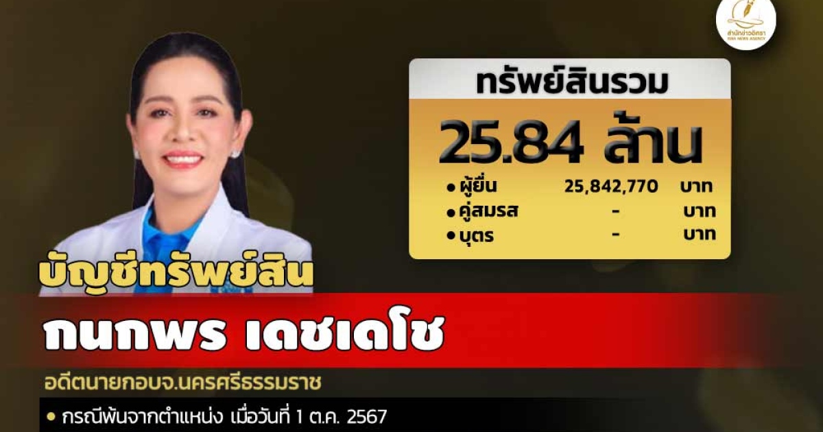 สำนักงานคณะกรรมการป้องกันและปราบปรามการทุจริตแห่งชาติ (ป.ป.ช.) เปิดเผยบัญชีแสดงทรัพย์สินและหนี้สินของ กนกพร เดชเดโช อดีตนายกอบจ.นครศรีธรรมราช ทรัพย์สิน 25.84 ล. ประกอบด้วย เงินฝาก 4 บัญชี มูลค่ารวม 945,770 บาท โรงเรือนและสิ่งปลูกสร้าง 3 หลัง ในจังหวัดนครศรีธรรมราช รวมมูลค่า 3.60 ล. ผู้ยื่นแจ้งมีรายได้ต่อปี 2.29 ล.