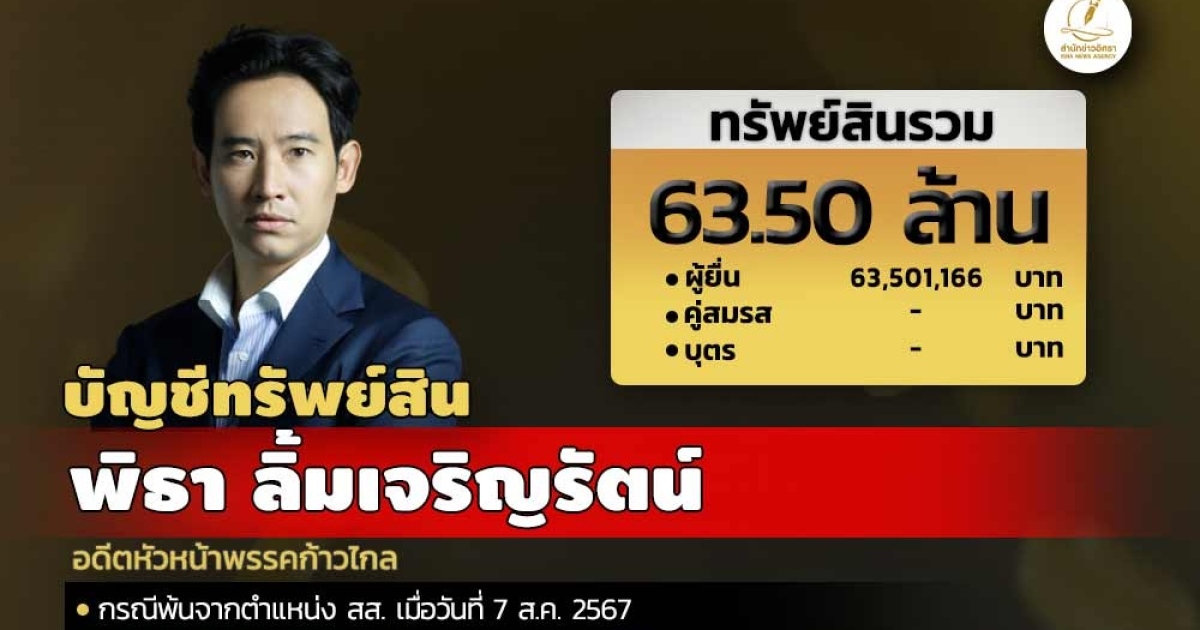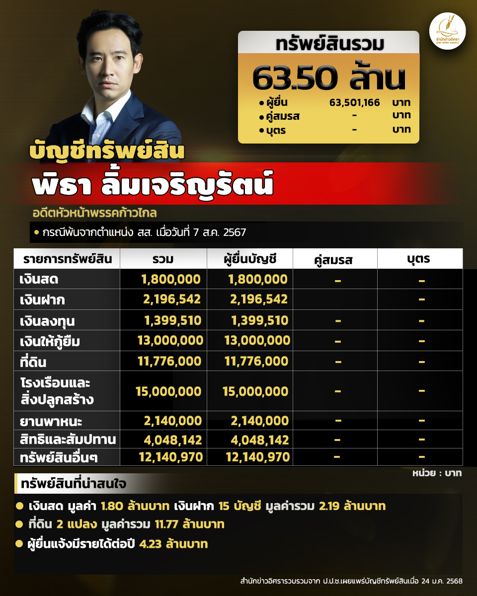 สำนักงานคณะกรรมการป้องกันและปราบปรามการทุจริตแห่งชาติ (ป.ป.ช.) เปิดเผยบัญชีแสดงทรัพย์สินและหนี้สินของ พิธา ลิ้มเจริญรัตน์ อดีตหัวหน้าพรรคก้าวไกล ทรัพย์สินทั้งหมด 63.50 ล. ได้แก่ เงินสด มูลค่า 1.80 ล. เงินฝาก 15 บัญชี มูลค่ารวม 2.19 ล. ที่ดิน 2 แปลง มูลค่ารวม 11.77 ล.ผู้ยื่นแจ้งมีรายได้ต่อปี 4.23 ล.