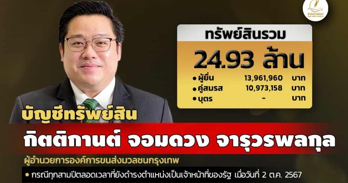 สำนักงานคณะกรรมการป้องกันและปราบปรามการทุจริตแห่งชาติ (ป.ป.ช.) เปิดเผยบัญชีแสดงทรัพย์สินและหนี้สินของ กิตติกานต์ จอมดวง จารุวรพลกุลผู้อำนวยการองค์การขนส่งมวลชนกรุงเทพ ทรัพย์สิน เงินสด มูลค่า 1.25 ล.เงินฝาก 11 บัญชี มูลค่า 1.07 ล. โรงเรือนและสิ่งปลูกสร้าง 2 หลัง มูลค่ารวม 3.50 ล. ผู้ยื่นแจ้งมีรายได้ต่อปี 3.68 ล.