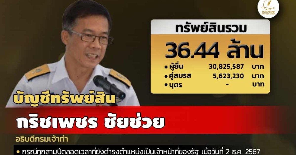 สำนักงานคณะกรรมการป้องกันและปราบปรามการทุจริตแห่งชาติ (ป.ป.ช.) เปิดเผยบัญชีแสดงทรัพย์สินและหนี้สินของ กริชเพชร ชัยช่วย อธิบดีกรมเจ้าท่า ทรัพย์สิน 36.44 ล. ประกอบด้วย เงินฝาก 15 บัญชี มูลค่า 4.03 ล. ที่ดิน 7 บัญชี มูลค่า 9.87 ล. โรงเรือนและสิ่งปลูกสร้าง 7 หลัง มูลค่ารวม 15.65 ล. ผู้ยื่นแจ้งมีรายได้ต่อปี 1.73 ล.