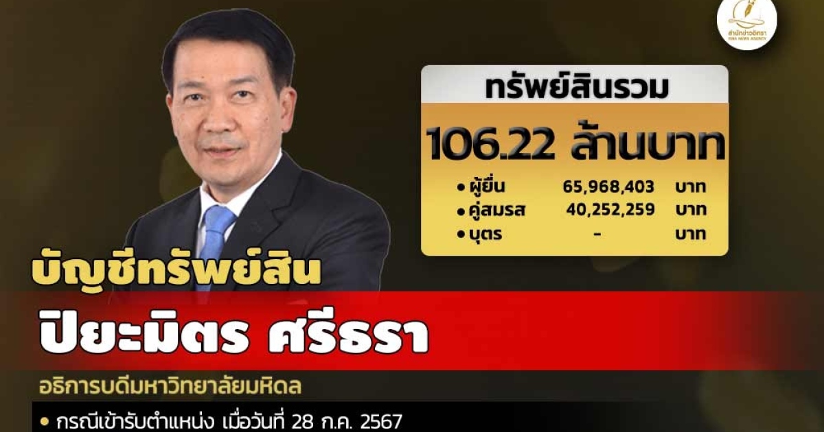 สำนักงานคณะกรรมการป้องกันและปราบปรามการทุจริตแห่งชาติ (ป.ป.ช.) เปิดเผยบัญชีแสดงทรัพย์สินและหนี้สินของ ปิยะมิตร ศรีธรา อธิการบดีมหาวิทยาลัยมหิดล ทรัพย์สินทั้งหมด 106.22 เช่น เงินฝาก 12 บัญชี มูลค่ารวม 15.75 ล. ที่ดิน 6 บัญชี มูลค่ารวม 16.92 ล. โรงเรือนและสิ่งปลูกสร้าง 5 หลัง รวมมูลค่า 39.20 ล. ผู้ยื่นแจ้งมีรายได้ต่อปี 10.70 ล.