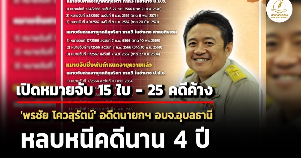 นายพรชัย โควสุรัตน์ อดีตนายกองค์การบริหารส่วนจังหวัด (อบจ.) อุบลราชธานี นักการเมืองท้องถิ่นชื่อดัง ที่เปลี่ยนสถานะกลายมาเป็นผู้ต้องหาตามหมายจับคดีทุจริต ออกหมายจับไปแล้วกว่า 15 หมาย และ ยังมีคดีค้างอีกกว่า 25 คดี สำนักข่าวอิศรา จึงนำข้อมูล มานำเสนอผ่านภาพอินโฟกราฟิก ดังนี้