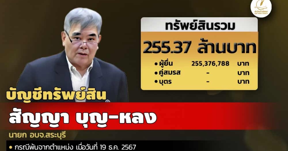 สำนักงานคณะกรรมการป้องกันและปราบปรามการทุจริตแห่งชาติ (ป.ป.ช.) เปิดเผยบัญชีแสดงทรัพย์สินและหนี้สินของ สัญญา บุญ-หลง นายก อบจ.สระบุรี ทรัพย์สิน 255.37 ล. ประกอบด้วย เงินสด มูลค่า 200,000 บาท เงินฝาก 33 บัญชี มูลค่ารวม 37.02 ล. โรงเรือนและสิ่งปลูกสร้าง 7 หลัง รวมมูลค่า 138.13 ล. ผู้ยื่นแจ้งมีรายได้ต่อปี 1.70 ล.