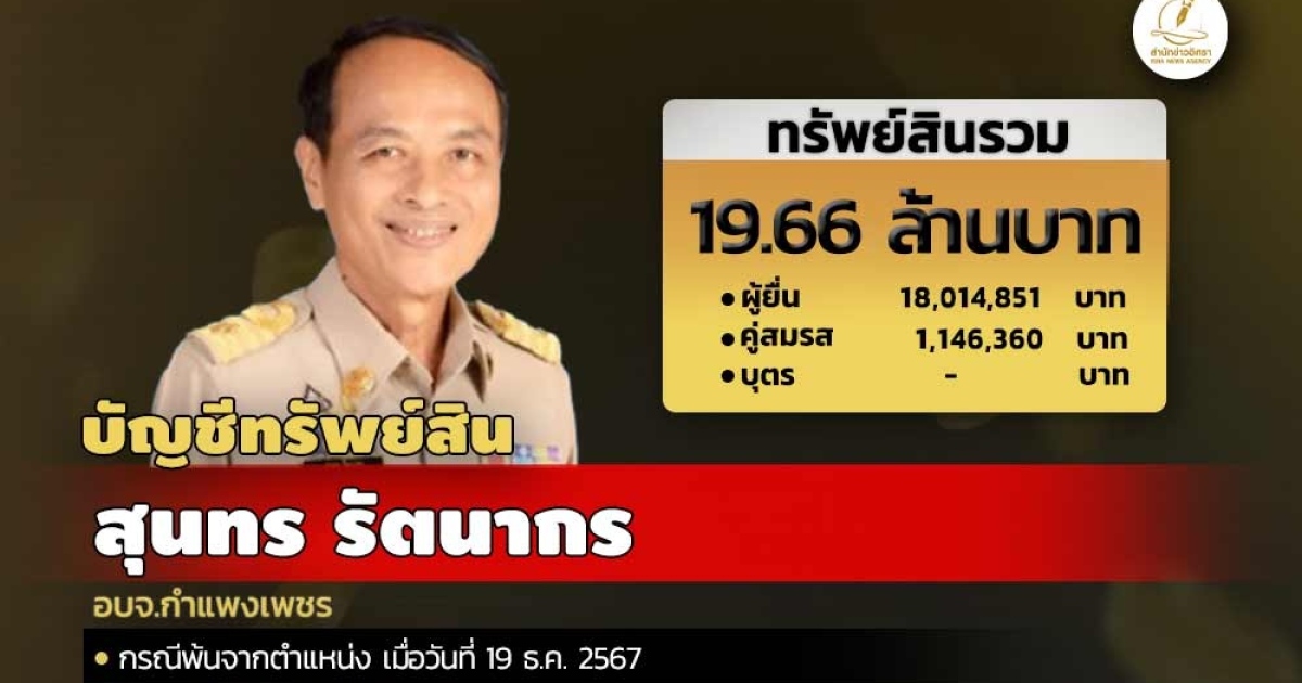 สำนักงานคณะกรรมการป้องกันและปราบปรามการทุจริตแห่งชาติ (ป.ป.ช.) เปิดเผยบัญชีแสดงทรัพย์สินและหนี้สินของ สุนทร รัตนากร อบจ.กำแพงเพชรมิ ทรัพย์สิน 19.66 ล. ประกอบด้วย เงินฝาก 6 บัญชี มูลค่ารวม 188,228 บาท ที่ดิน 2 แปลง มูลค่า 17.15 ล. โรงเรือนและสิ่งปลูกสร้าง 1 หลัง รวมมูล 700,000 บาท ผู้ยื่นแจ้งมีรายได้ต่อปี 1.14 ล.