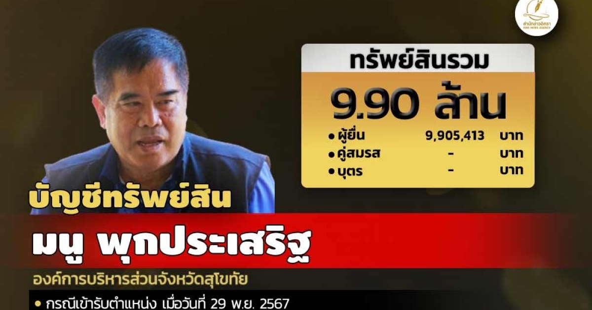 สำนักงานคณะกรรมการป้องกันและปราบปรามการทุจริตแห่งชาติ (ป.ป.ช.) เปิดเผยบัญชีแสดงทรัพย์สินและหนี้สินของ มนู พุกประเสริฐ องค์การบริหารส่วนจังหวัดสุโขทัย ทรัพย์สิน 9.90 ล. ประกอบด้วย เงินฝาก 4 บัญชี มูลค่า 2.55 ล. ที่ดิน 3 แปลง มูลค่า 3.72 ล. โรงเรือนและสิ่งปลูกสร้าง 1 หลัง มูลค่า 1.50 ล. ผู้ยื่นแจ้งมีรายได้ต่อปี 1.17 ล.