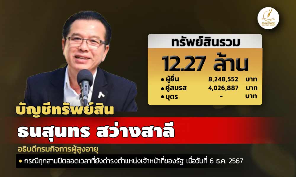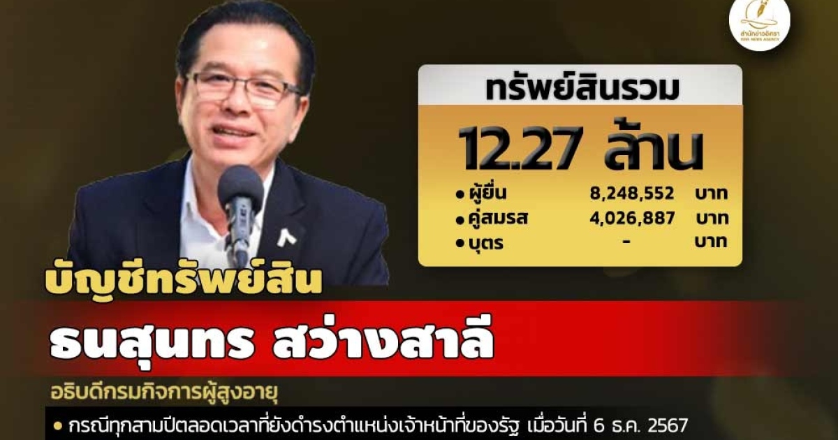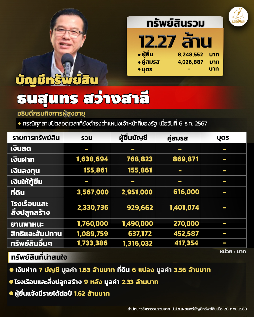 สำนักงานคณะกรรมการป้องกันและปราบปรามการทุจริตแห่งชาติ (ป.ป.ช.) เปิดเผยบัญชีแสดงทรัพย์สินและหนี้สินของ ธนสุนทร สว่างสาลี อธิบดีกรมกิจการผู้สูงอายุ ทรัพย์สิน 12.27 ล. ประกอบด้วย เงินฝาก 7 บัญชี มูลค่า 1.63 ล. ที่ดิน 6 แปลง มูลค่า 3.56 ล. โรงเรือนและสิ่งปลูกสร้าง 9 หลัง มูลค่า 2.33 ล. ผู้ยื่นแจ้งมีรายได้ต่อปี 1.62 ล.