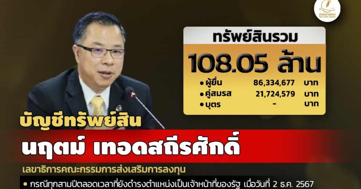 สำนักงานคณะกรรมการป้องกันและปราบปรามการทุจริตแห่งชาติ (ป.ป.ช.) เปิดเผยบัญชีแสดงทรัพย์สินและหนี้สินของ นฤตม์ เทอดสถีรศักดิ์ เลขาธิการคณะกรรมการส่งเสริมการลงทุน ทรัพย์สิน 108.05 ล. ประกอบด้วย เงินฝาก 18 บัญชี มูลค่า 4.52 ล. ที่ดิน 9 แปลง มูลค่า 54.20 ล. โรงเรือนและสิ่งปลูกสร้าง 5 หลัง มูลค่า 14.80 ล. ผู้ยื่นแจ้งมีรายได้ต่อปี 2.21 ล.