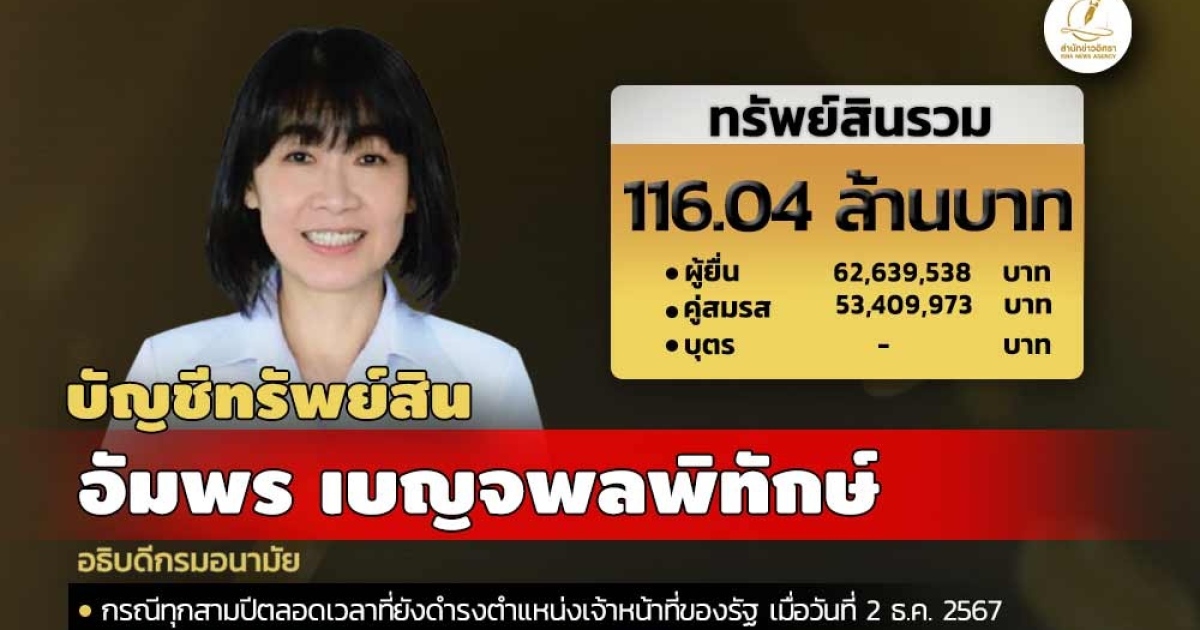 สำนักงานคณะกรรมการป้องกันและปราบปรามการทุจริตแห่งชาติ (ป.ป.ช.) เปิดเผยบัญชีแสดงทรัพย์สินและหนี้สินของ อัมพร เบญจพลพิทักษ์ อธิบดีกรมอนามัย ทรัพย์สิน 116.04 ล. ประกอบด้วย เงินฝาก 23 บัญชี มูลค่ารวม 34.11 ล. โรงเรือนและสิ่งปลูกสร้าง 4 หลัง มูลค่า 8.30 ล. ผู้ยื่นแจ้งมีรายได้ต่อปี 2.57 ล.