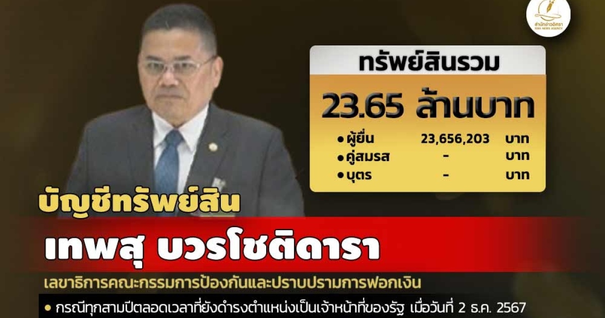 สำนักงานคณะกรรมการป้องกันและปราบปรามการทุจริตแห่งชาติ (ป.ป.ช.) เปิดเผยบัญชีแสดงทรัพย์สินและหนี้สินของ เทพสุ บวรโชติดารา เลขาธิการคณะกรรมการป้องกันและปราบปรามการฟอกเงิน ทรัพย์สิน 23.65 ล. ประกอบด้วย เงินฝาก 12 บัญชี มูลค่ารวม 3.18 ล. ที่ดิน 12 แปลง มูลค่ารวม 4.77 ล. โรงเรือนและสิ่งปลูกสร้าง 7 หลัง มูลค่า 11.59 ล. ผู้ยื่นแจ้งมีรายได้ต่อปี 2.23 ล.