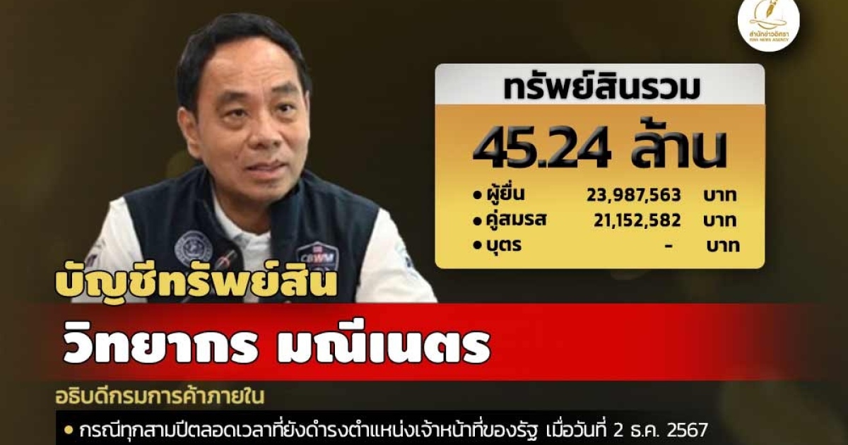 สำนักงานคณะกรรมการป้องกันและปราบปรามการทุจริตแห่งชาติ (ป.ป.ช.) เปิดเผยบัญชีแสดงทรัพย์สินและหนี้สินของ วิทยากร มณีเนตร อธิบดีกรมการค้าภายใน ทรัพย์สิน 45.24 ล. ประกอบด้วย เงินฝาก 5 บัญชี มูลค่ารวม 2.37 ล. ที่ดิน 2 แปลง มูลค่า 5.03 ล. โรงเรือนและสิ่งปลูกสร้าง 1 รายการ มูลค่ารวม 3 ล. ผู้ยื่นแจ้งมีรายได้ต่อปีโดยประมาณ 1.70 ล.