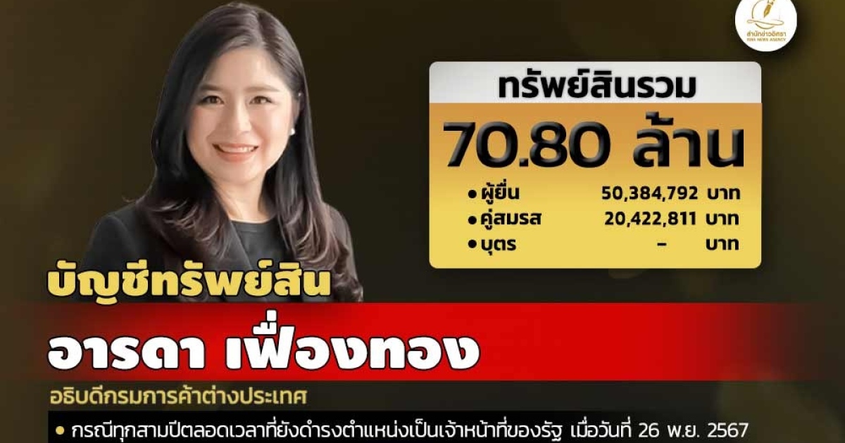 สำนักงานคณะกรรมการป้องกันและปราบปรามการทุจริตแห่งชาติ (ป.ป.ช.) เปิดเผยบัญชีแสดงทรัพย์สินและหนี้สินของอารดา เฟื่องทอง อธิบดีกรมการค้าต่างประเทศ ทรัพย์สิน 70.80 ล. ประกอบด้วย เงินฝาก 13 บัญชี มูลค่ารวม 9.76 ล. ที่ดิน 2 แปลง มูลค่ารวม 5.05 ล. โรงเรือนและสิ่งปลูกสร้าง 3 หลัง มูลค่ารวม 7.85 ล. ผู้ยื่นแจ้งมีรายได้ต่อปี 1.50 ล.