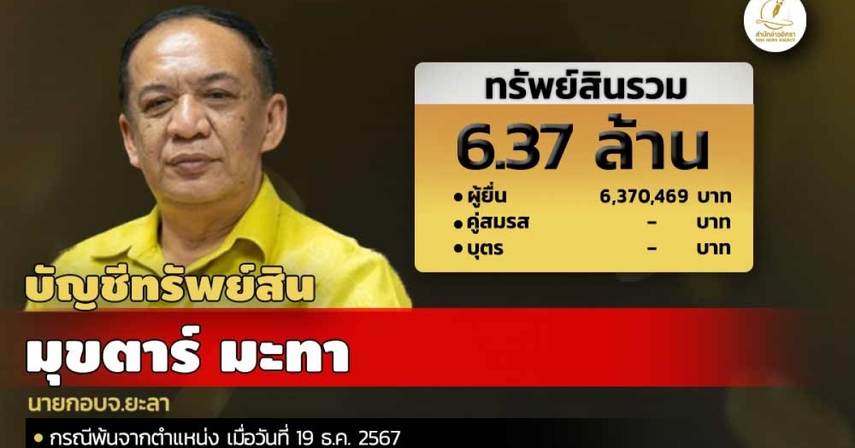 สำนักงานคณะกรรมการป้องกันและปราบปรามการทุจริตแห่งชาติ (ป.ป.ช.) เปิดเผยบัญชีแสดงทรัพย์สินและหนี้สินของ มุขตาร์ มะทา นายกอบจ.ยะลา ทรัพย์สิน 6.37 ล. ประกอบด้วย เงินฝาก 5 บัญชี มูลค่ารวม 420,469 บาท ที่ดิน 2 แปลง มูลค่า 3 ล. โรงเรือนและสิ่งปลูกสร้าง 1 หลัง มูลค่า 2.50 ล. ผู้ยื่นแจ้งมีรายได้ต่อปี 1.05 ล.