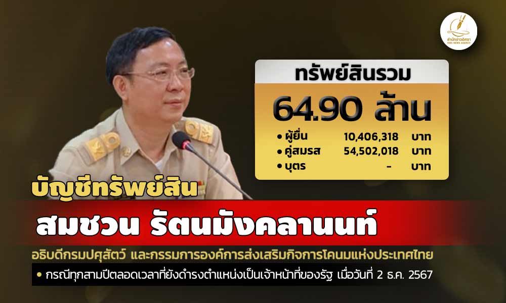 สำนักงานคณะกรรมการป้องกันและปราบปรามการทุจริตแห่งชาติ (ป.ป.ช.) เปิดเผยบัญชีแสดงทรัพย์สินและหนี้สินของ สมชวน รัตนมังคลานนท์ อธิบดีกรมปศุสัตว์ และกรรมการองค์การส่งเสริมกิจการโคนมแห่งประเทศไทย ทรัพย์สิน 64.90 ล. ประกอบด้วย เงินฝาก 11 บัญชี มูลค่า 5.24 ล. ที่ดิน 12 แปลง มูลค่า 18.60 ล. โรงเรือนและสิ่งปลูกสร้าง 7 หลัง มูลค่า 8.59 ล. ผู้ยื่นแจ้งมีรายได้ต่อปีโดยประมาณ 1.94 ล.