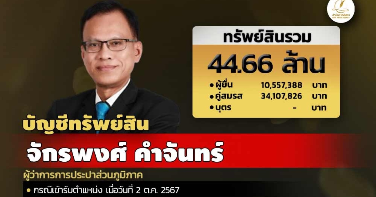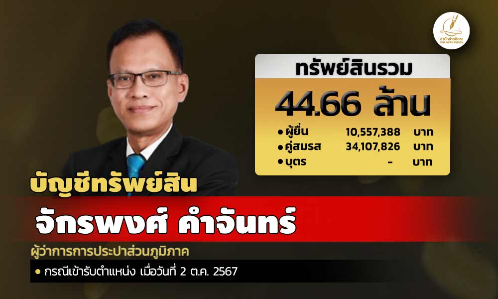 สำนักงานคณะกรรมการป้องกันและปราบปรามการทุจริตแห่งชาติ (ป.ป.ช.) เปิดเผยบัญชีแสดงทรัพย์สินและหนี้สินของ จักรพงศ์ คำจันทร์ ผู้ว่าการการประปาส่วนภูมิภาค ทรัพย์สิน 44.66 ล. ประกอบด้วย เงินฝาก 10 บัญชี มูลค่า 2.94 ล. ที่ดิน 6 แปลง มูลค่า 18.70 ล. โรงเรือนและสิ่งปลูกสร้าง 3 หลัง มูลค่า 14 ล. ผู้ยื่นแจ้งมีรายได้ต่อปีโดยประมาณ 4.27 ล.