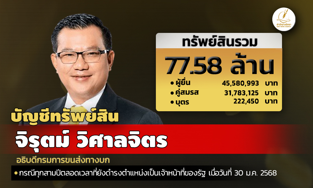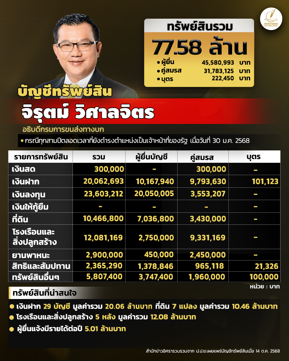 สำนักงานคณะกรรมการป้องกันและปราบปรามการทุจริตแห่งชาติ (ป.ป.ช.) เปิดเผยบัญชีแสดงทรัพย์สินและหนี้สินของ จิรุตม์ วิศาลจิตร อธิบดีกรมการขนส่งทางบก ทรัพย์สิน 77.58 ล. ประกอบด้วย เงินฝาก 29 บัญชี มูลค่ารวม 20.06 ล. ที่ดิน 7 แปลง มูลค่ารวม 10.46 ล. โรงเรือนและสิ่งปลูกสร้าง 5 หลัง มูลค่ารวม 12.08 ล. ผู้ยื่นแจ้งมีรายได้ต่อปี 5.01 ล.
