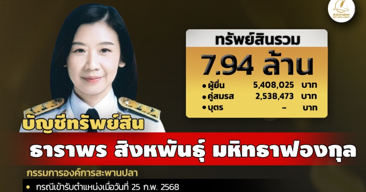 สำนักงานคณะกรรมการป้องกันและปราบปรามการทุจริตแห่งชาติ (ป.ป.ช.) เปิดเผยบัญชีแสดงทรัพย์สินและหนี้สินของ ธาราพร สิงหพันธุ์ มหิทธาฟองกุล กรรมการองค์การสะพานปลา ทรัพย์สิน 7.94 ล. ประกอบด้วย เงินฝาก 11 บัญชี มูลค่ารวม 3.36 ล. ที่ดิน 2 แปลง มูลค่ารวม 1.88 ล. ผู้ยื่นแจ้งมีรายได้ต่อปี 973,880 บาท