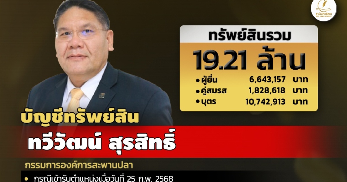 สำนักงานคณะกรรมการป้องกันและปราบปรามการทุจริตแห่งชาติ (ป.ป.ช.) เปิดเผยบัญชีแสดงทรัพย์สินและหนี้สินของ ทวีวัฒน์ สุรสิทธิ์ กรรมการองค์การสะพานปลา ทรัพย์สิน 19.21 ล. ประกอบด้วย เงินฝาก 20 บัญชี มูลค่ารวม 12.05 ล. ที่ดิน 2 แปลง มูลค่ารวม 2.12 ล. ผู้ยื่นแจ้งมีรายได้ต่อปี 1.70 ล.