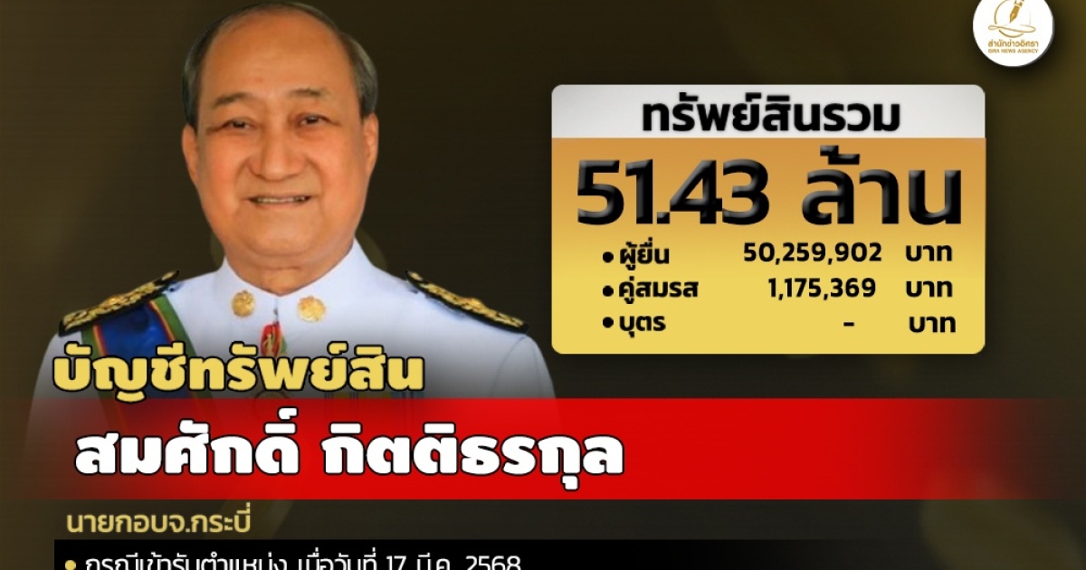 สำนักงานคณะกรรมการป้องกันและปราบปรามการทุจริตแห่งชาติ (ป.ป.ช.) เปิดเผยบัญชีแสดงทรัพย์สินและหนี้สินของ สมศักดิ์ กิตติธรกุล นายกอบจ.กระบี่ ทรัพย์สิน 51.43255.45 ล. ประกอบด้วย เงินฝาก 3 บัญชี มูลค่ารวม 3.75 ล. ที่ดิน 17 แปลง มูลค่ารวม 23.85 ล. ผู้ยื่นแจ้งมีรายได้ต่อปี 867,122 บาท