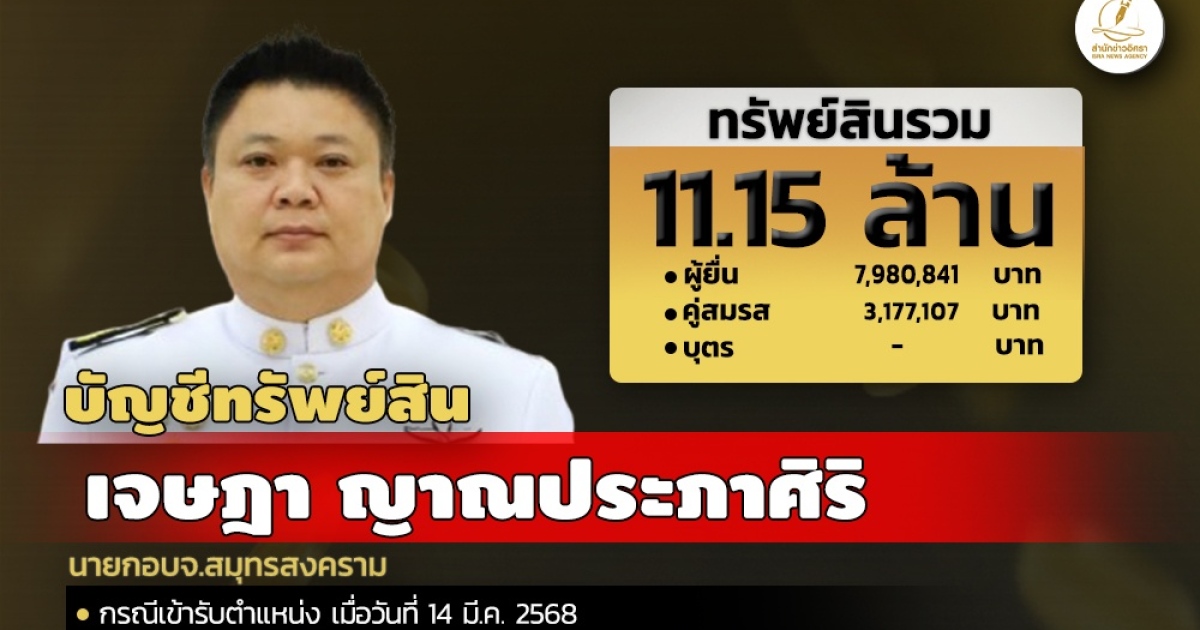 สำนักงานคณะกรรมการป้องกันและปราบปรามการทุจริตแห่งชาติ (ป.ป.ช.) เปิดเผยบัญชีแสดงทรัพย์สินและหนี้สินของ เจษฎา ญาณประภาศิริ นายกอบจ.สมุทรสงคราม ทรัพย์สิน 11.15 ล. ประกอบด้วย เงินฝาก 6 บัญชี มูลค่ารวม 22,748 บาท ที่ดิน 4 แปลง มูลค่ารวม 5 ล. โรงเรือนและสิ่งปลูกสร้าง 1 หลัง มูลค่ารวม 2 ล. ผู้ยื่น แจ้งมีรายได้ต่อปีโดยประมาณ 594,658 บาท