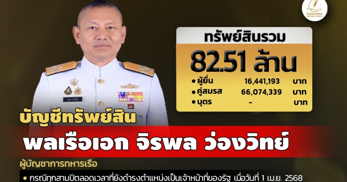 สำนักงานคณะกรรมการป้องกันและปราบปรามการทุจริตแห่งชาติ (ป.ป.ช.) เปิดเผยบัญชีแสดงทรัพย์สินและหนี้สินของ พลเรือเอก จิรพล ว่องวิทย์ ผู้บัญชาการทหารเรือ ทรัพย์สิน 82.51 ล. ประกอบด้วย เงินฝาก 21 บัญชี มูลค่ารวม 15.38 ล. ที่ดิน 17 แปลง มูลค่ารวม 20.81 ล. โรงเรือนและสิ่งปลูกสร้าง 6 หลัง มูลค่ารวม 32.55 ล. ผู้ยื่น แจ้งมีรายได้ต่อปีโดยประมาณ 2.22 ล.