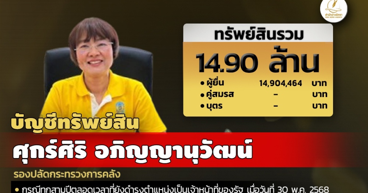 สำนักงานคณะกรรมการป้องกันและปราบปรามการทุจริตแห่งชาติ (ป.ป.ช.) เปิดเผยบัญชีแสดงทรัพย์สินและหนี้สินของ ศุกร์ศิริ อภิญญานุวัฒน์ รองปลัดกระทรวงการคลัง ทรัพย์สิน 14.90 ล. ประกอบด้วย เงินฝาก 2 บัญชี มูลค่า 1.08 ล. ที่ดิน 1 แปลง มูลค่า 4 ล. ผู้ยื่น แจ้งมีรายได้ต่อปีโดยประมาณ 4.79 ล.
