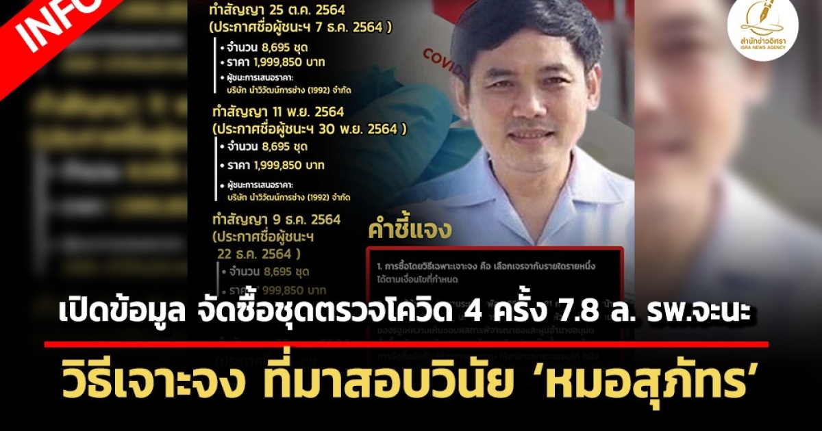 • เปิดข้อมูลจัดซื้อชุดตรวจโควิด 4 ครั้ง 7.8 ล. วิธีเจาะจง ที่มาสอบวินัย ‘หมอสุภัทร’