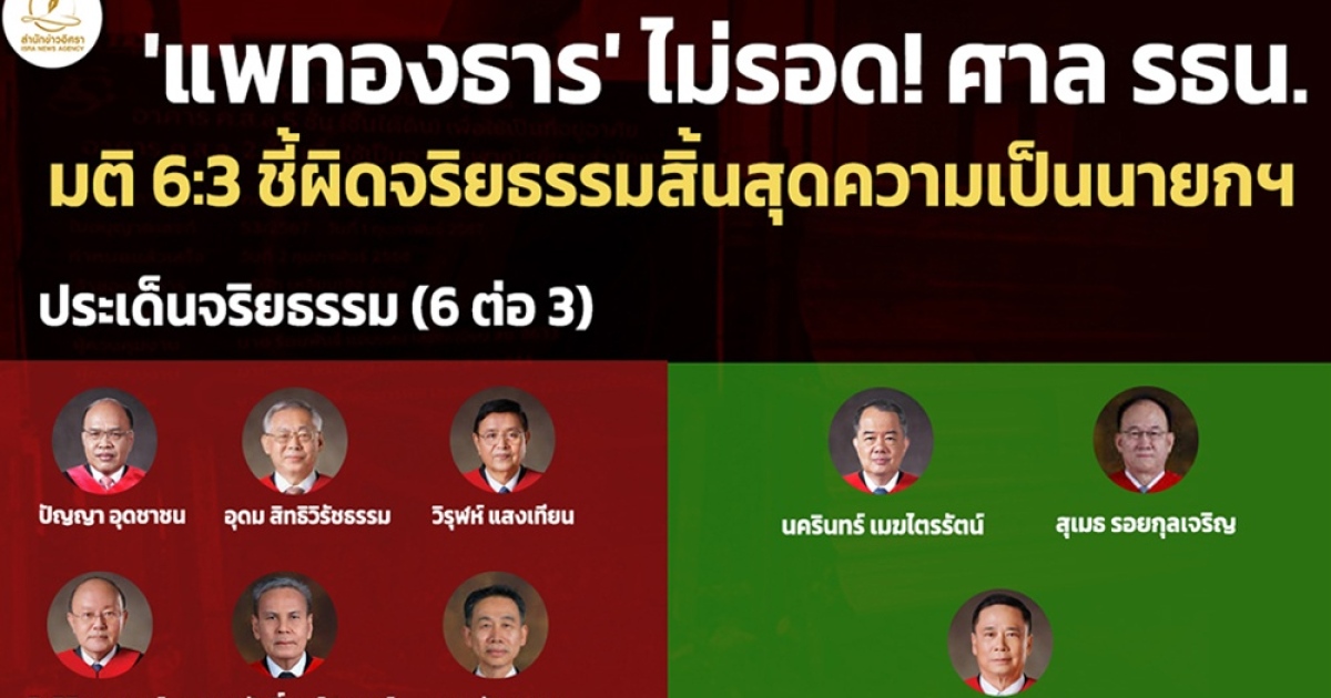 - 'แพทองธาร' ไม่รอด! ศาล รธน. มติ 6:3 ชี้ผิดจริยธรรมสิ้นสุดความเป็นนายกฯ-ครม.พ้นทั้งคณะ