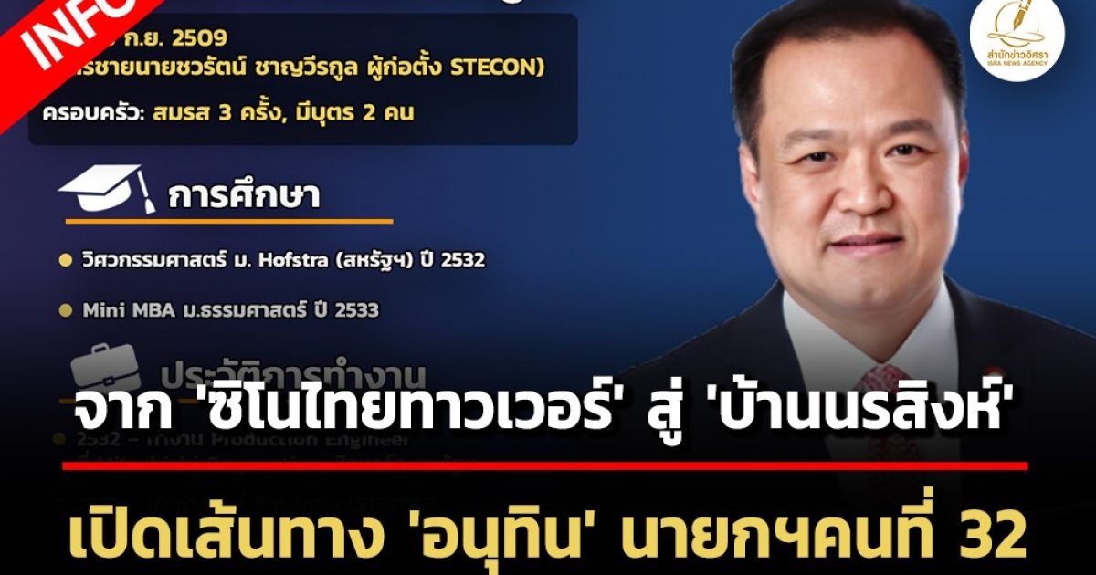 ที่ประชุมสมาชิกสภาผู้แทนราษฎร วันที่ 5 กันยายน 2568 ลงมติเสียงส่วนใหญ่ 311 เสียง ต่อ 152 เสียง งดออกเสียง 27 เสียง ให้ นายอนุทิน ชาญวีรกูล หัวหน้าพรรคภูมิใจไทย เป็นนายกรัฐมนตรีคนใหม่ (คนที่ 32) ของประเทศไทย ปูมประวัติของนายอนุทินเป็นนักธุรกิจหมื่นล้าน ฐานธุรกิจเจ้าของบริษัท ซิโน-ไทย เอ็นจิเนียริ่ง แอนด์ คอนสตรัคชั่น จำกัด รับเหมาก่อสร้างรายใหญ่ สำนักข่าวอิศรา จึงรวบรวมมานำเสนอผ่านภาพอินโฟกราฟิก ดังนี้
