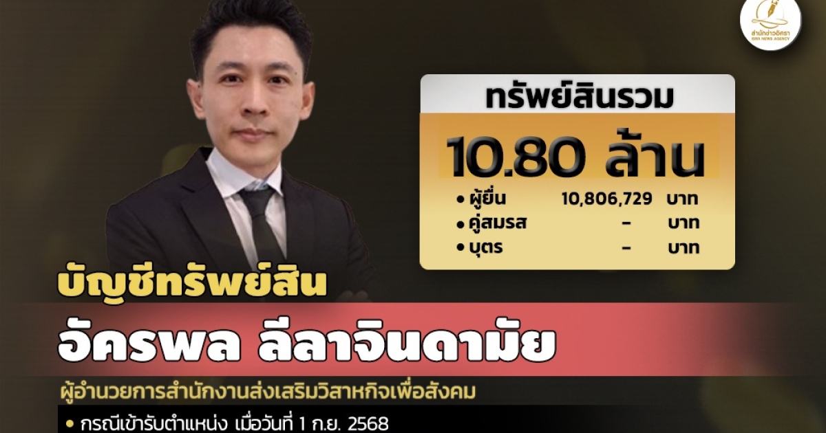 สำนักงานคณะกรรมการป้องกันและปราบปรามการทุจริตแห่งชาติ (ป.ป.ช.) เปิดเผยบัญชีแสดงทรัพย์สินและหนี้สินของ อัครพล ลีลาจินดามัย ผอ.สำนักงานส่งเสริมวิสาหกิจเพื่อสังคม ทรัพย์สิน 10.80 ล. ประกอบด้วย เงินฝาก 5 บัญชี มูลค่ารวม 6.02 ล. ผู้ยื่นแจ้งมีรายได้ต่อปี 795,000 บาท