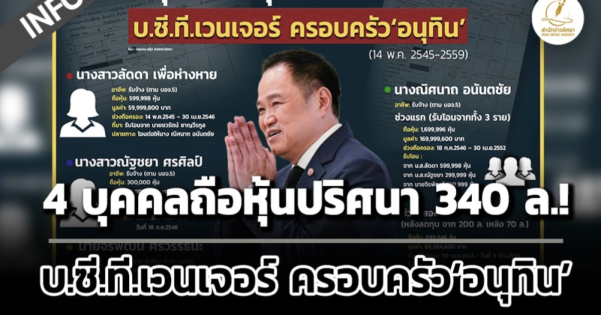ล่าสุด สำนักข่าวอิศรา สรุปข้อมูลการถือครองหุ้นบริษัท ซี.ที. เวนเจอร์ จำกัด ของบุคคล 4 ราย ประกอบเอกสารบัญชีรายชื่อผู้ถือหุ้น (บอจ.5) ดังนี้
