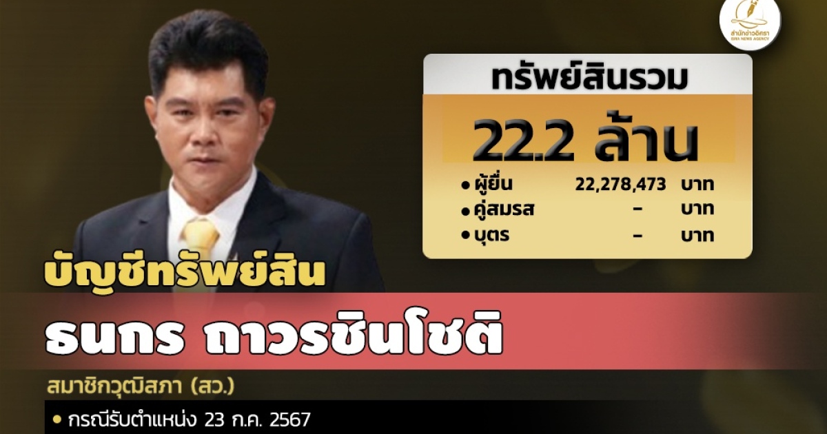 สำนักงานคณะกรรมการป้องกันและปราบปรามการทุจริตแห่งชาติ (ป.ป.ช.) เปิดเผยบัญชีแสดงทรัพย์สินและหนี้สินของ ธนกร ถาวรชินโชติ สมาชิกวุฒิสภา (สว.) ทรัพย์สิน 22.2 ล. ประกอบด้วย เงินฝาก 11 บัญชี มูลค่ารวม 670,000 บาท ที่ดิน 3 แปลง มูลค่า 1.10 ล. โรงเรือนและสิ่งปลูกสร้าง บ้านตึกแถว 2 ชั้น มูลค่า 600,000 บาท ทรัพย์สินอื่น 3.09 ล. ทรัพย์สินอื่น เช่น เลสข้อมือทองฝังเพชร แหวนทองคำ ฝังเพชร 7 วง สร้อยคอทองคำ 2 เส้น พระเลี่ยมทอง 12 องค์ นาฬิกาโรเล็กซ์ 1 เรือน