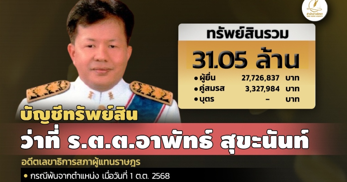 สำนักงานคณะกรรมการป้องกันและปราบปรามการทุจริตแห่งชาติ (ป.ป.ช.) เปิดเผยบัญชีแสดงทรัพย์สินและหนี้สินของ ว่าที่ ร.ต.ต.อาพัทธ์ สุขะนันท์ อดีตเลขาธิการสภาผู้แทนราษฎร ทรัพย์สิน 31.05 ล. ประกอบด้วย เงินฝาก 7 บัญชี มูลค่ารวม 6.27 ล. ที่ดิน 10 แปลง มูลค่า 13.18 ล. โรงเรือนและสิ่งปลูกสร้าง 2 หลัง มูลค่า 1.40 ล. ผู้ยื่นแจ้งมีรายได้ต่อปี 3.15 ล.
