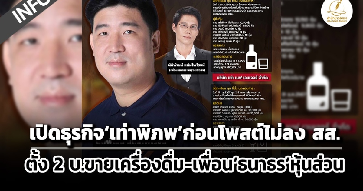 เปิดธุรกิจ ‘เท่าพิภพ ลิ้มจิตรกร’ สส. กรุงเทพฯ พรรคประชาชน ก่อนโพสต์วางมือ หลังดัน สุราก้าวหน้า เจ้าของบริษัทขายเครื่องดื่มแอลกอฮอล์2 แห่ง ‘นิติพัฒน์’เพื่อน ‘ธนาธร’หุ้นส่วน รายได้ปีล่าสุด 1.7 ล. มีรายละเอียดดังนี้