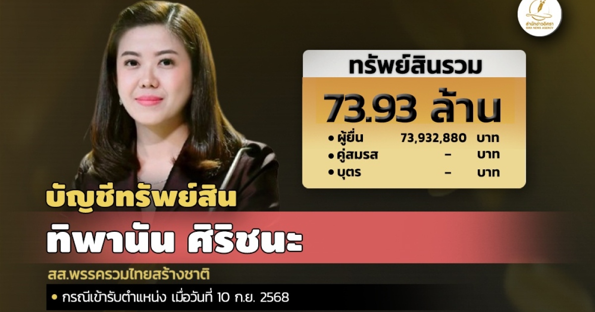 สำนักงานคณะกรรมการป้องกันและปราบปรามการทุจริตแห่งชาติ (ป.ป.ช.) เปิดเผยบัญชีแสดงทรัพย์สินและหนี้สินของ ทิพานัน ศิริชนะ สส.พรรครวมไทยสร้างชาติ ทรัพย์สิน 73.93 ล. ประกอบด้วย เงินฝาก 14 บัญชี มูลค่ารวม 1 ล. ที่ดิน 2 แปลง มูลค่า 5.70 ล. โรงเรือนและสิ่งปลูกสร้าง 5 หลัง มูลค่า 29.75 ล. ทรัพย์สินอื่น 11.56 ล้านบาท เช่น อัญมณี ทองคำ พระเครื่อง เป็นต้น