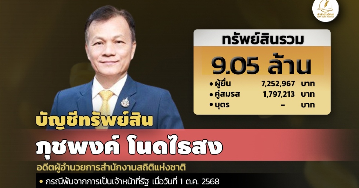 สำนักงานคณะกรรมการป้องกันและปราบปรามการทุจริตแห่งชาติ (ป.ป.ช.) เปิดเผยบัญชีแสดงทรัพย์สินและหนี้สินของ ภุชพงค์ โนดไธสง อดีตผู้อำนวยการสำนักงานสถิติแห่งชาติ ทรัพย์สิน 9.05 ล. ประกอบด้วย เงินฝาก 11 บัญชี มูลค่ารวม 8.14 ล. ที่ดิน 3 แปลง มูลค่า 6.42 ล. โรงเรือนและสิ่งปลูกสร้าง 1 หลัง มูลค่า 680,000 บาท ทรัพย์สินอื่น 170,000 บาท เช่น พระเลี่ยมทอง สายสร้อยทองห้อยพระเลี่ยมทอง