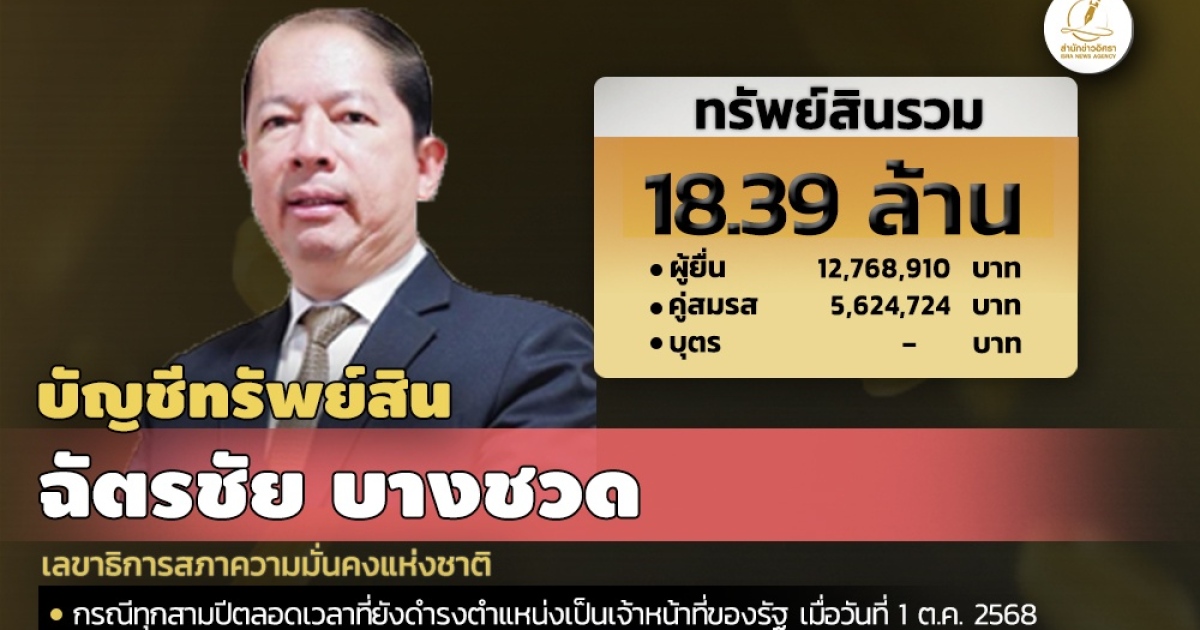 สำนักงานคณะกรรมการป้องกันและปราบปรามการทุจริตแห่งชาติ (ป.ป.ช.) เปิดเผยบัญชีแสดงทรัพย์สินและหนี้สินของ ฉัตรชัย บางชวด เลขาธิการสภาความมั่นคงแห่งชาติ ทรัพย์สิน 18.39 ล. ประกอบด้วย เงินฝาก 8 บัญชี มูลค่ารวม 322,205 บาท ที่ดิน 5 แปลง มูลค่า 2.87 ล. โรงเรือนและสิ่งปลูกสร้าง 2 หลัง มูลค่า 5.72 ล. นายฉัตรชัย แจ้งมีรายได้ต่อปีโดยประมาณ 1.91 ล.